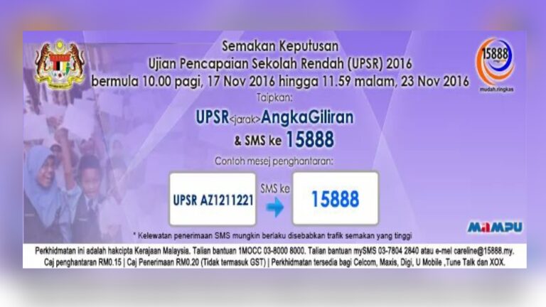 Cara Semak Keputusan UPSR 2016 Guna SMS Keputusan UPSR 2016 akan diumumkan pada ketetapan berikut: Keputusan Ujian Pencapaian Sekolah Rendah 2016 Tarikh: 17 NOVEMBER 2016 Hari: Khamis Calon boleh mendapatkan keputusan di sekolah masing-masing bermula 10 pagi. Semakan melalui […]