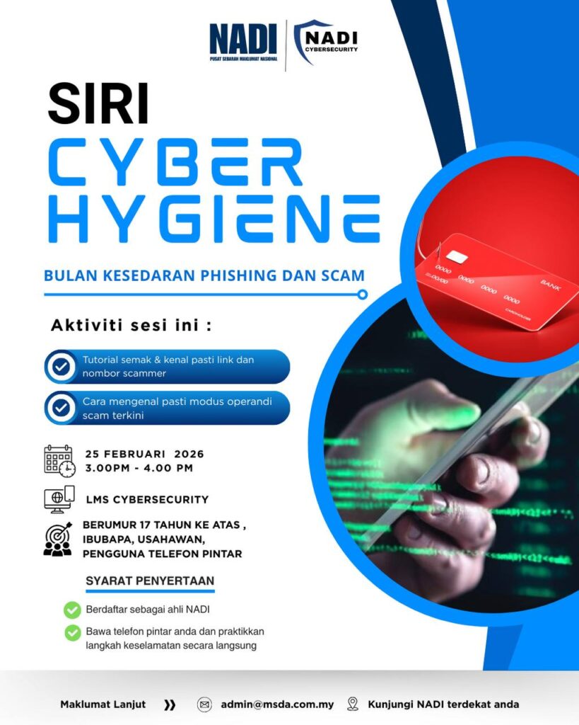 Sukacita dimaklumkan bahawa pihak NADI bersama NADI Cybersecurity akan mengadakan siri Cyber Hygiene bagi sesi Februari sempena Bulan Kesedaran Phishing dan Scam.